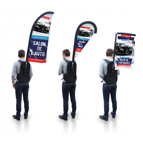 Parfait pour une utilisation nomade lors de salon, expositions, foires ou manifestations intérieures comme extérieures. Le sac à dos drapeau publicitaire (street flag) est la version moderne (et plus efficace) de l’homme sandwich. Avec 3, formes de drapeau au choix (carré, goutte d’eau ou plume), notre sac à dos offre de nombreux rangement pour vos flyer ou tracts, bouteille d’eau et téléphone. Existe aussi au format X-banner.